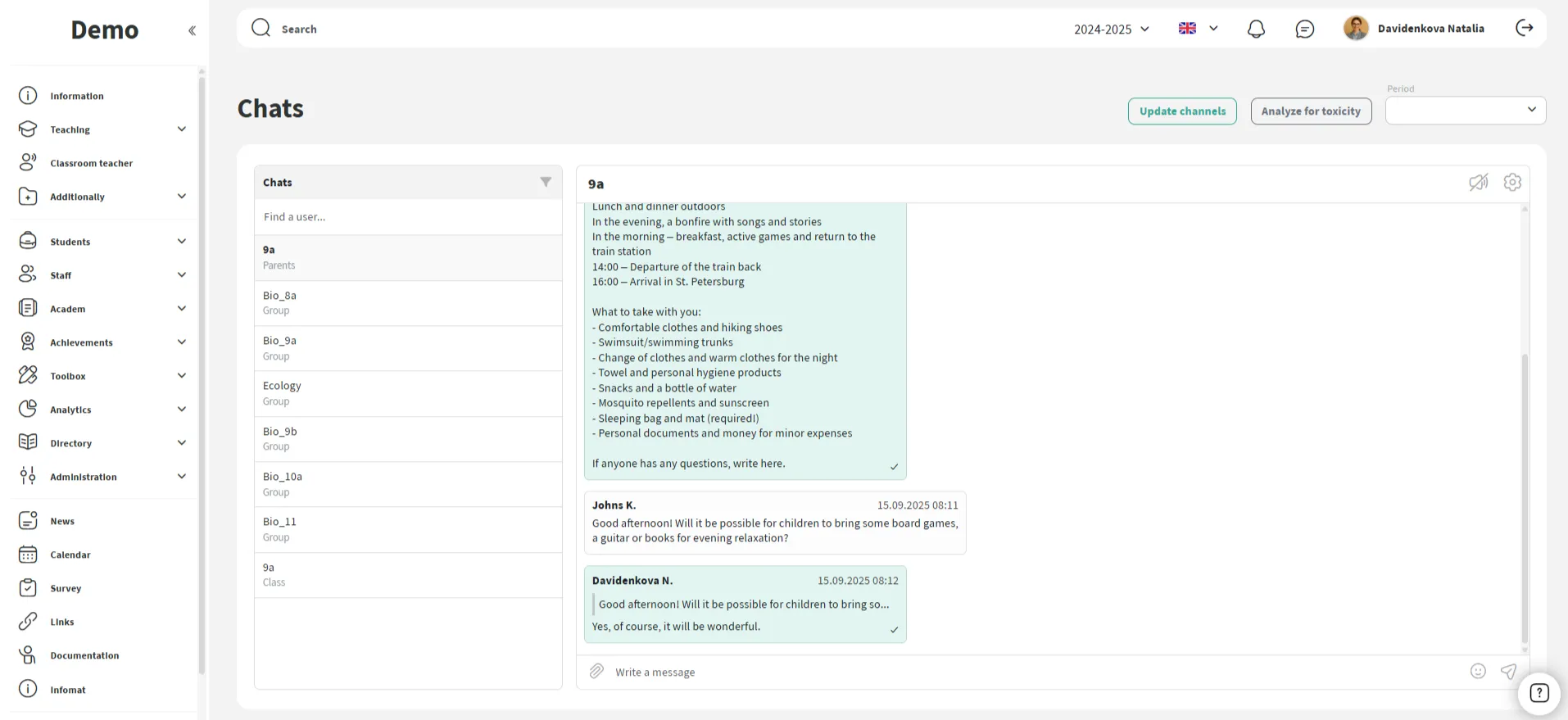 A administração da escola pode analisar as conversas e identificar tópicos sensíveis com antecedência — para prevenir possíveis mal-entendidos e conflitos.