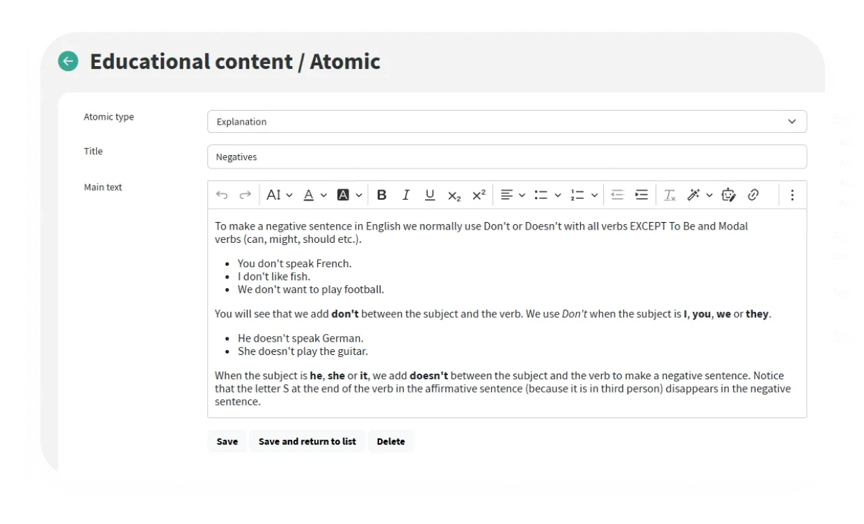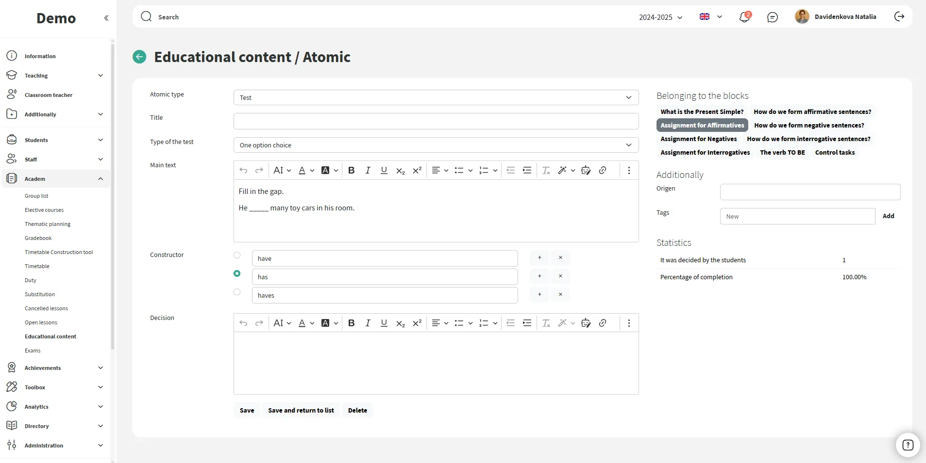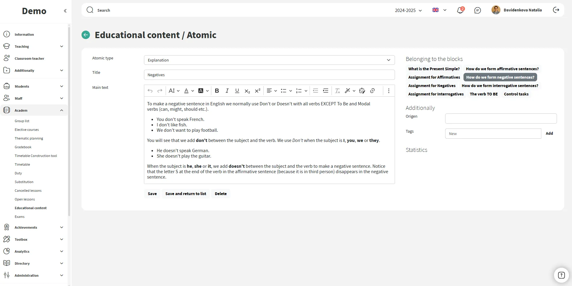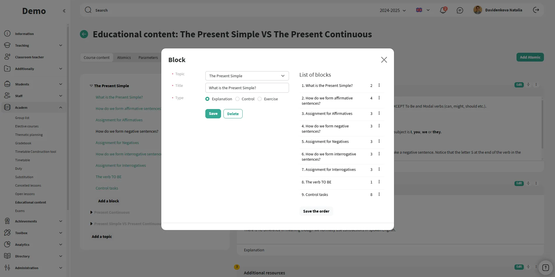 Adiciona blocos (teoria, tarefas práticas, atividades avaliativas)