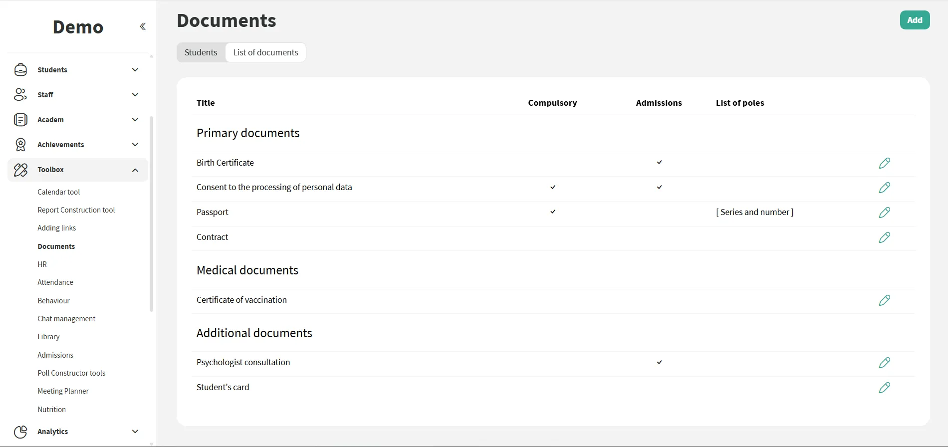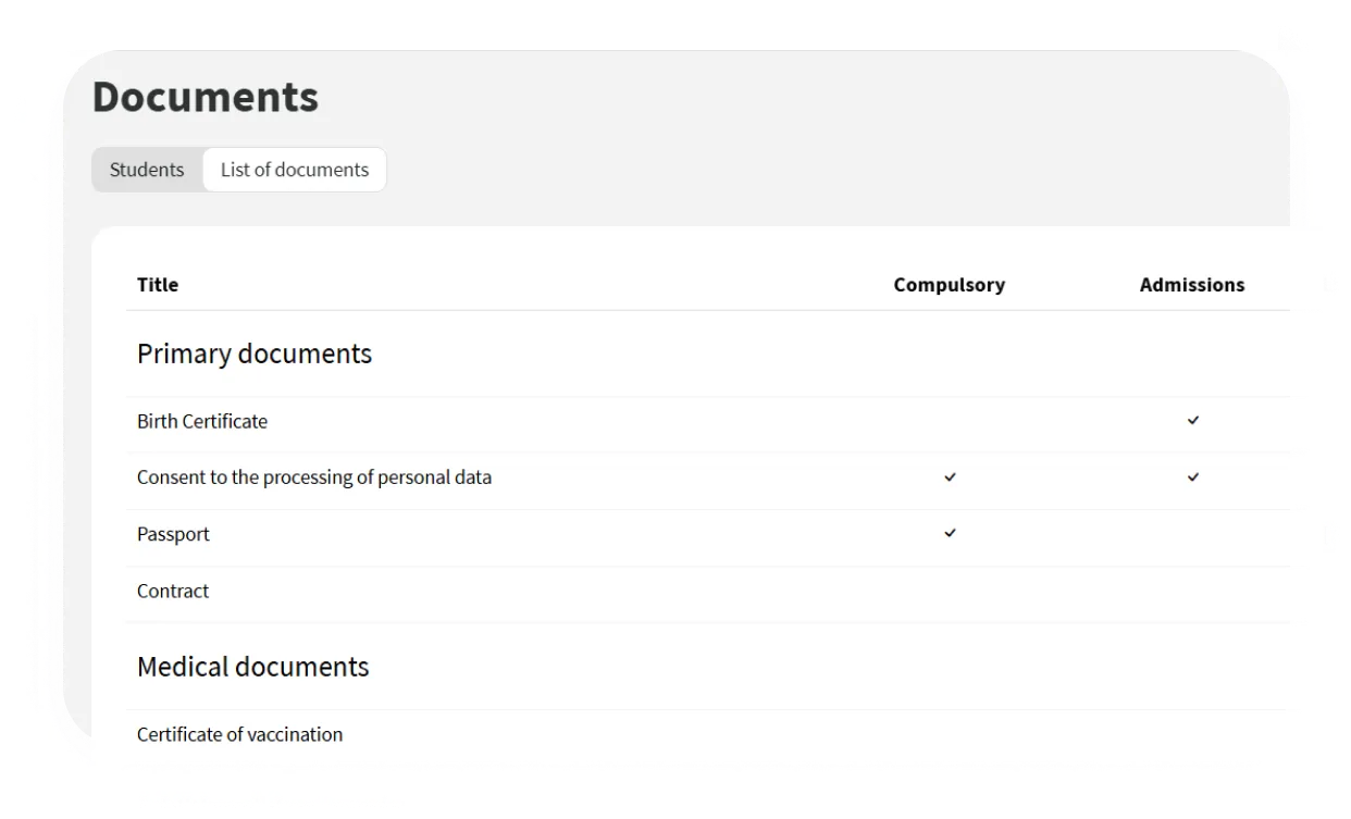 Você especifica quais documentos são necessários para admissão, educação e registros médicos. Para cada documento, é possível fazer upload de um arquivo e adicionar campos extras com informações relacionadas.