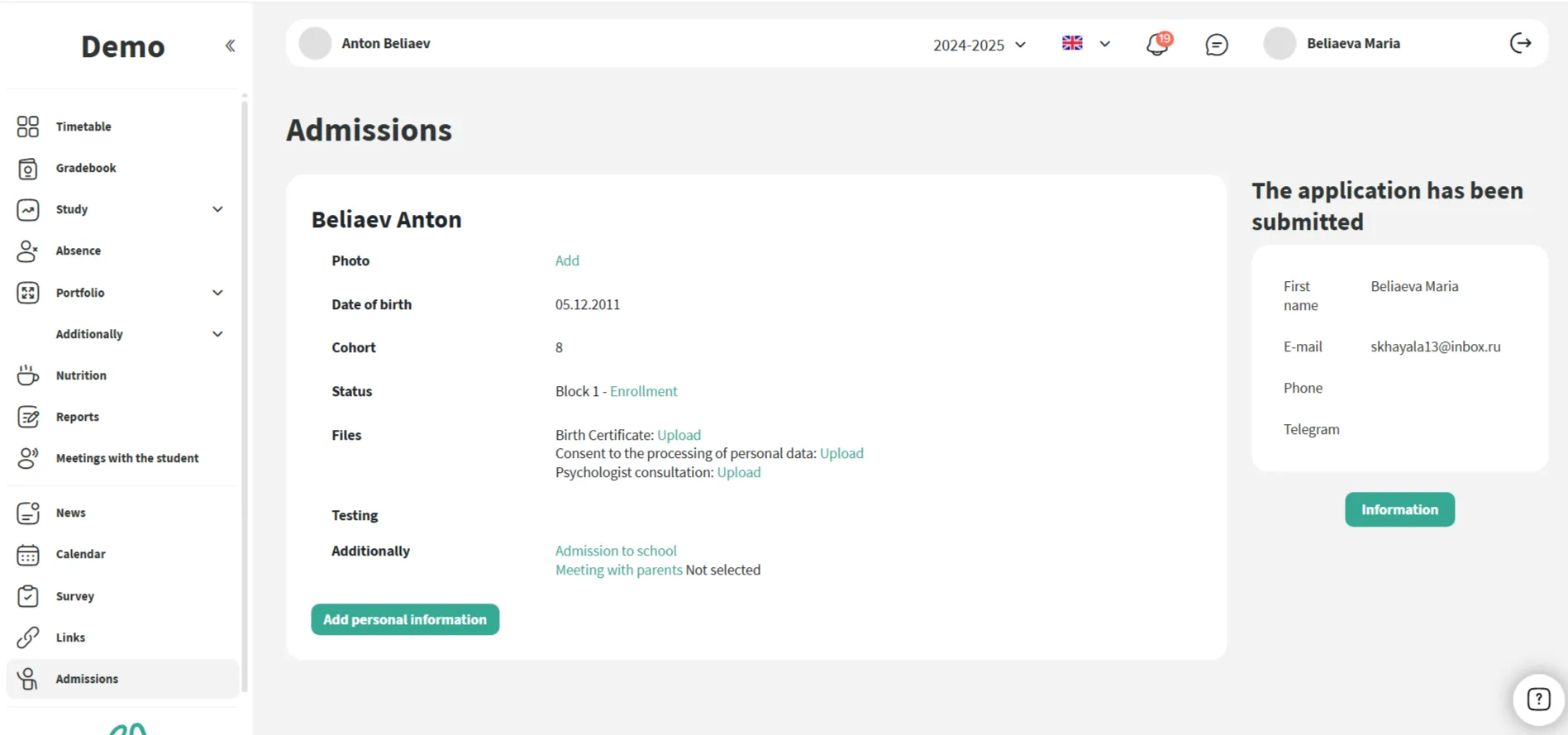 Se o módulo "Admissão" for usado, os pais podem anexar os arquivos necessários diretamente em sua conta pessoal — sem sobrecarregar a administração.