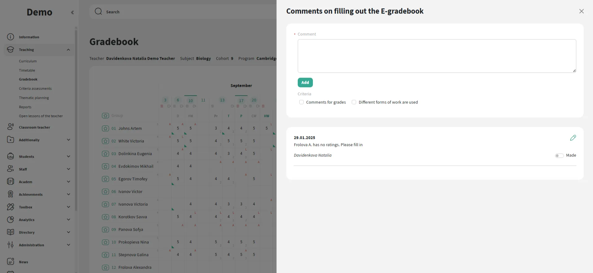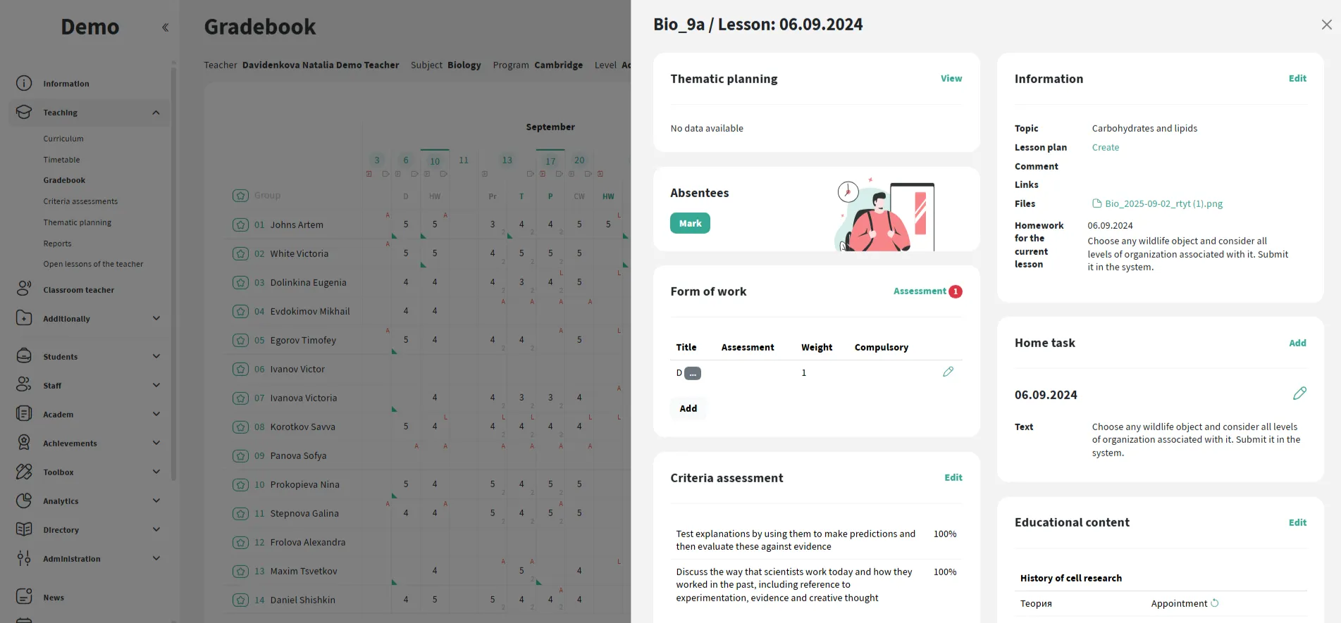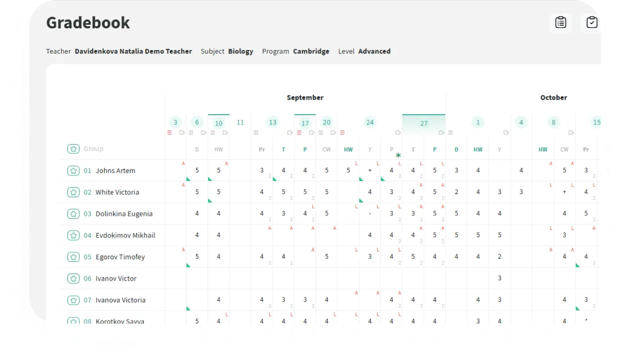 Diretamente no diário de notas, o professor marca os alunos ausentes e atrasados. As informações ficam imediatamente disponíveis para a administração e os pais. A escola pode configurar um formato conveniente: por padrão, todos os alunos são considerados presentes ou ausentes.