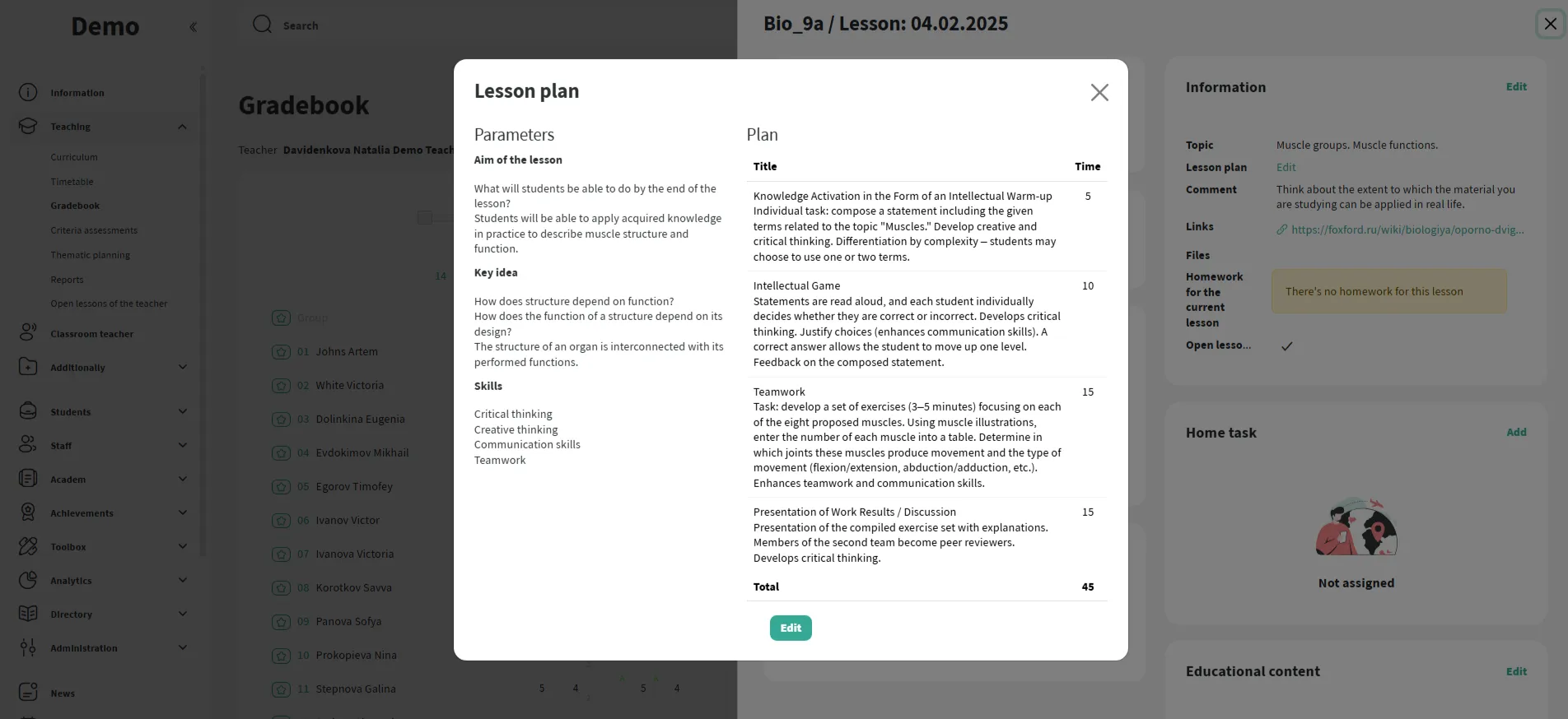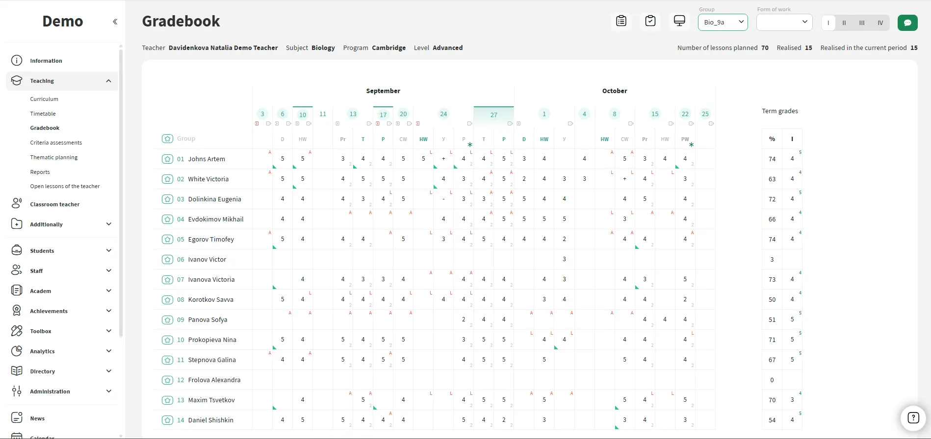 Todas as aulas, notas, presença e dinâmicas de desempenho são reunidas em um só lugar. É fácil para os professores analisarem o progresso dos alunos e para a administração monitorar a qualidade do ensino e a atualização do diário de notas.