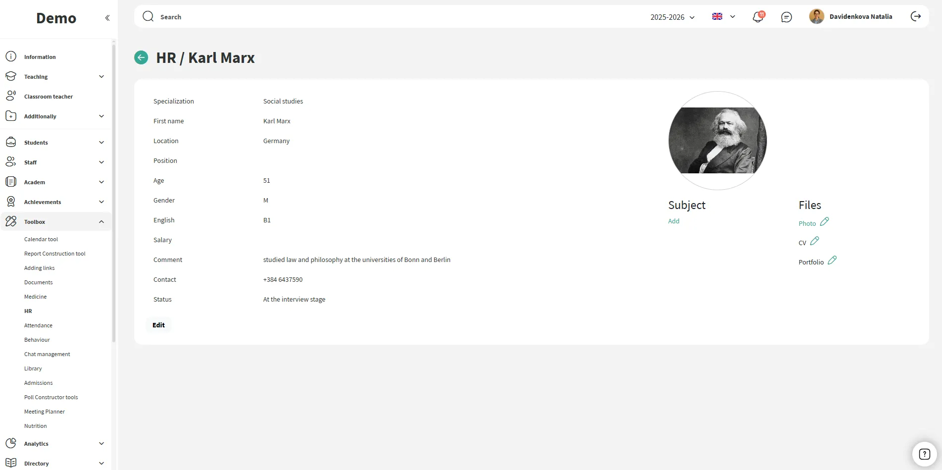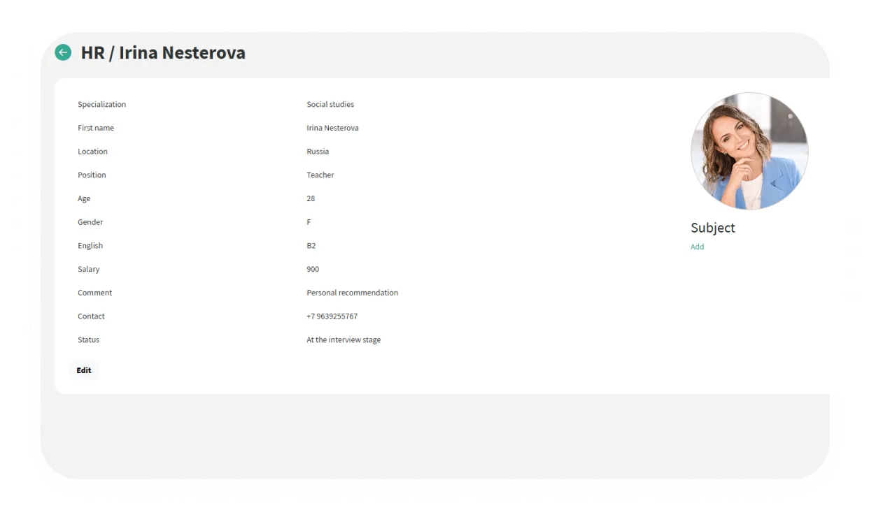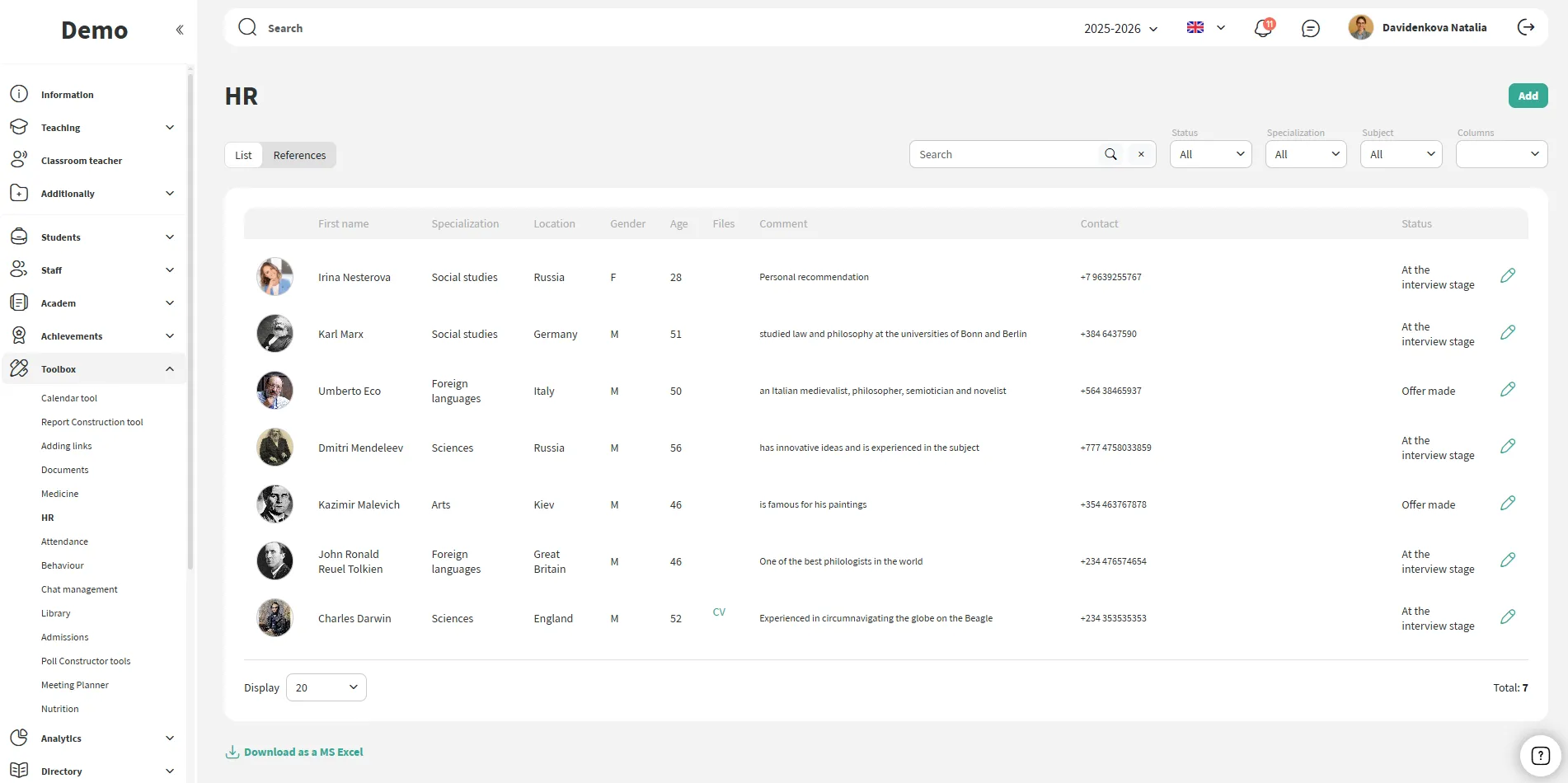 Use filtros flexíveis para encontrar rapidamente candidatos adequados por disciplina, idiomas, especialização, status e outros critérios.