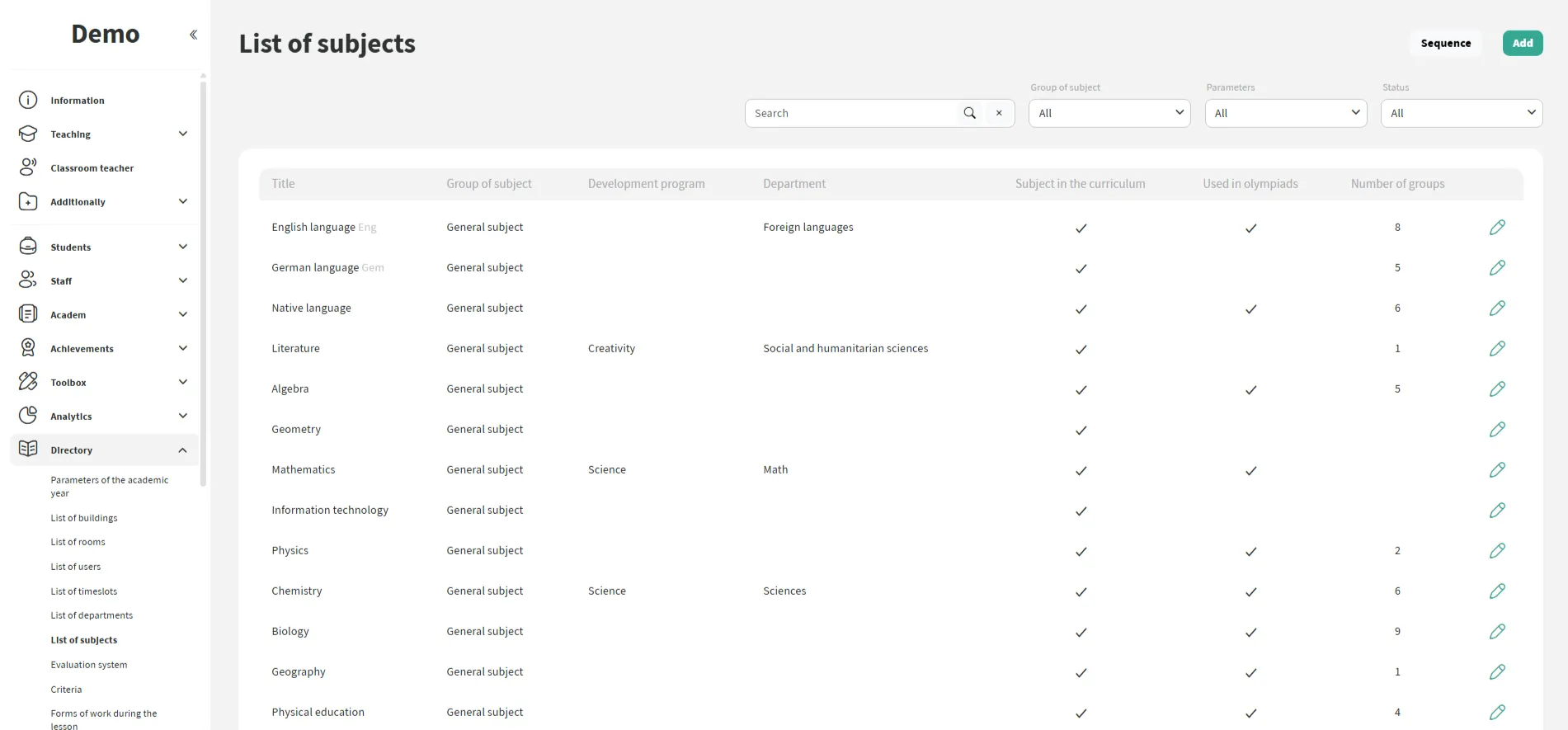 O diretório de disciplinas permite que a escola defina seu próprio currículo. As disciplinas configuradas são usadas nos diários de classe, nos horários e nos relatórios de desempenho.