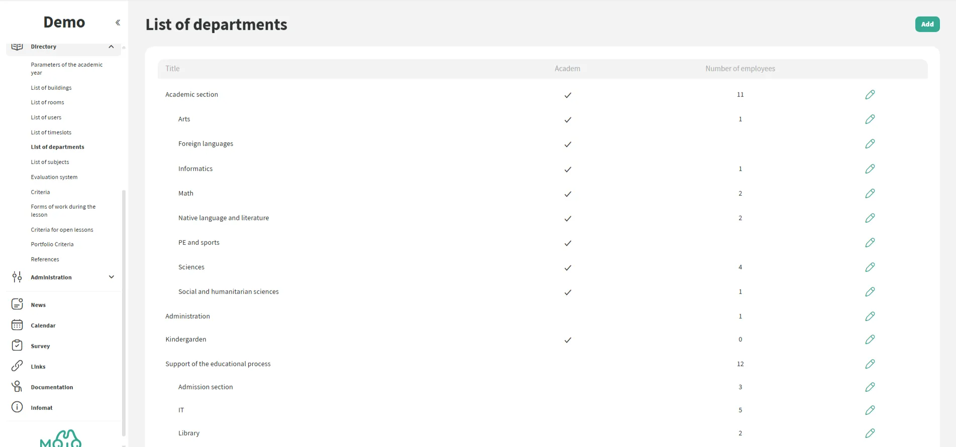 Crie departamentos acadêmicos e atribua professores por especialização. Isso simplifica a distribuição da carga horária, a busca por substitutos e a análise das áreas de conhecimento.