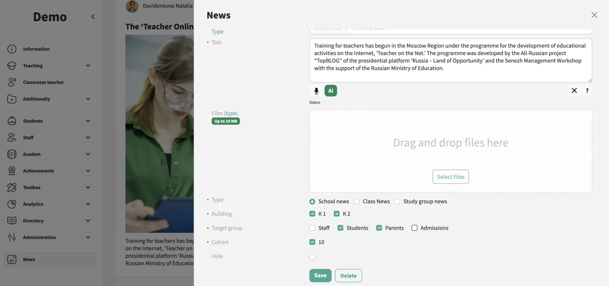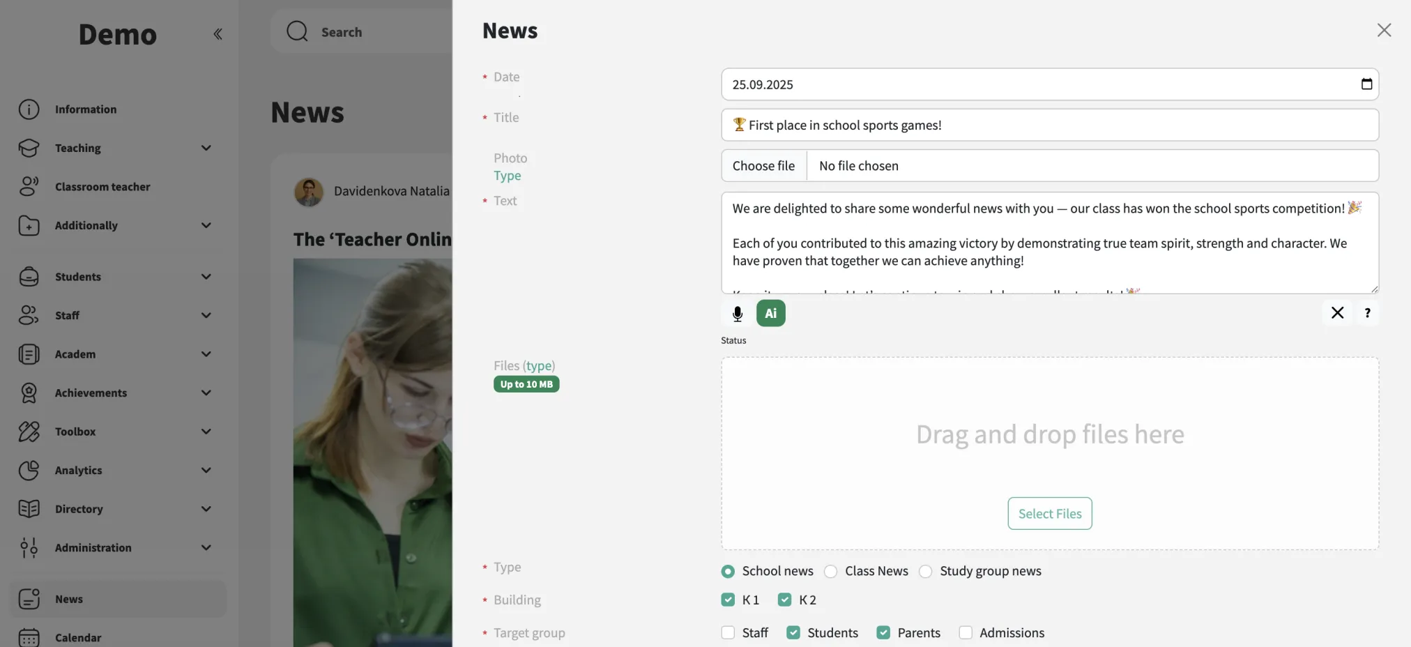 Defina a visibilidade de cada notícia para o público certo: pais, alunos, funcionários ou turmas e grupos específicos.