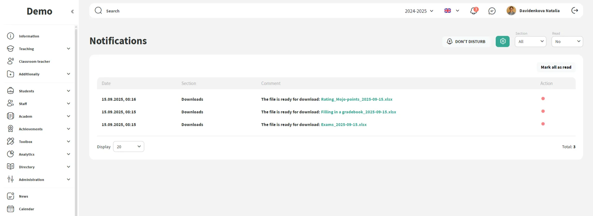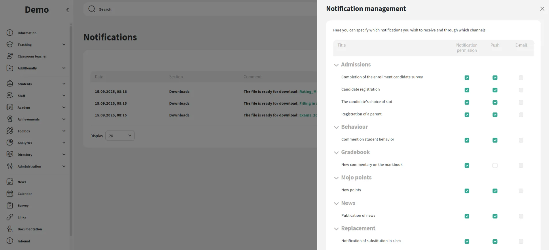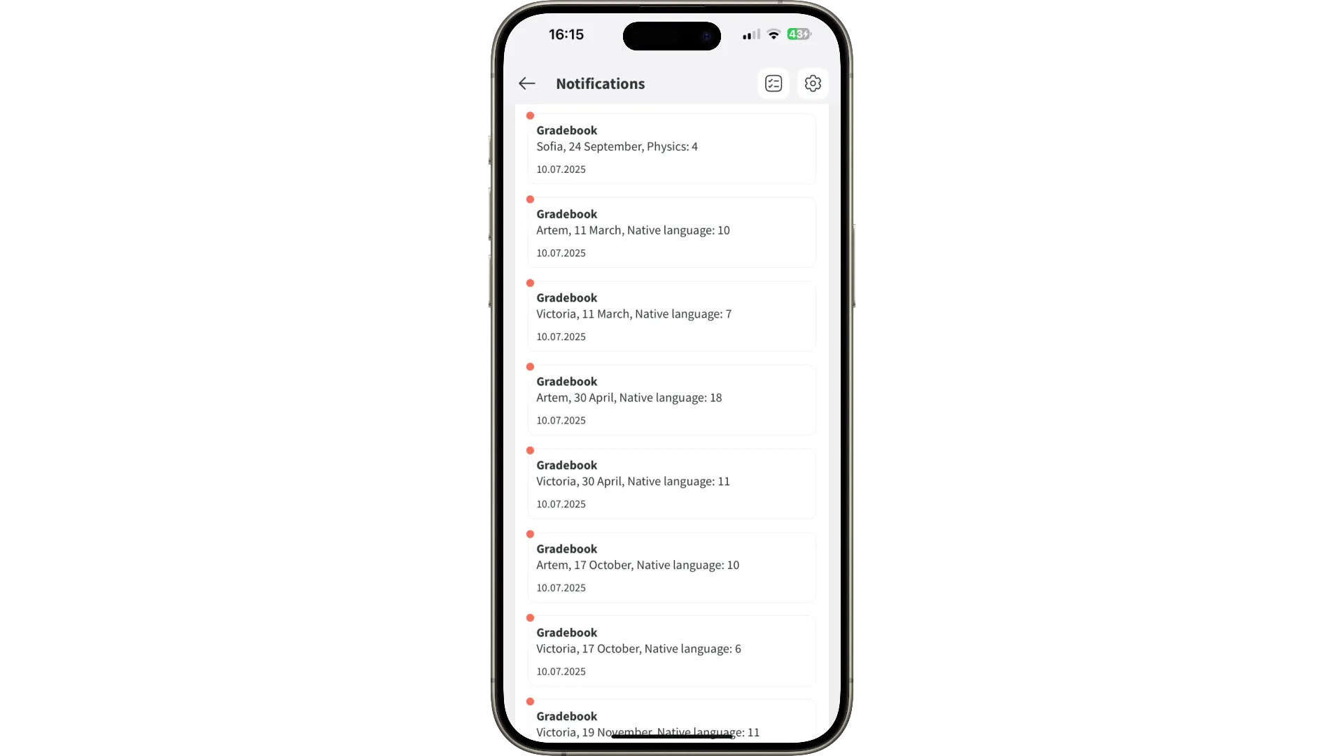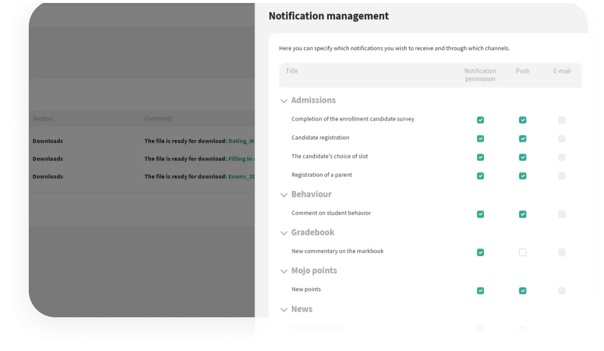 Novas notas, tarefas, comportamento, relatórios, substituições, publicações e status de matrícula — tudo entregue de forma imediata.
