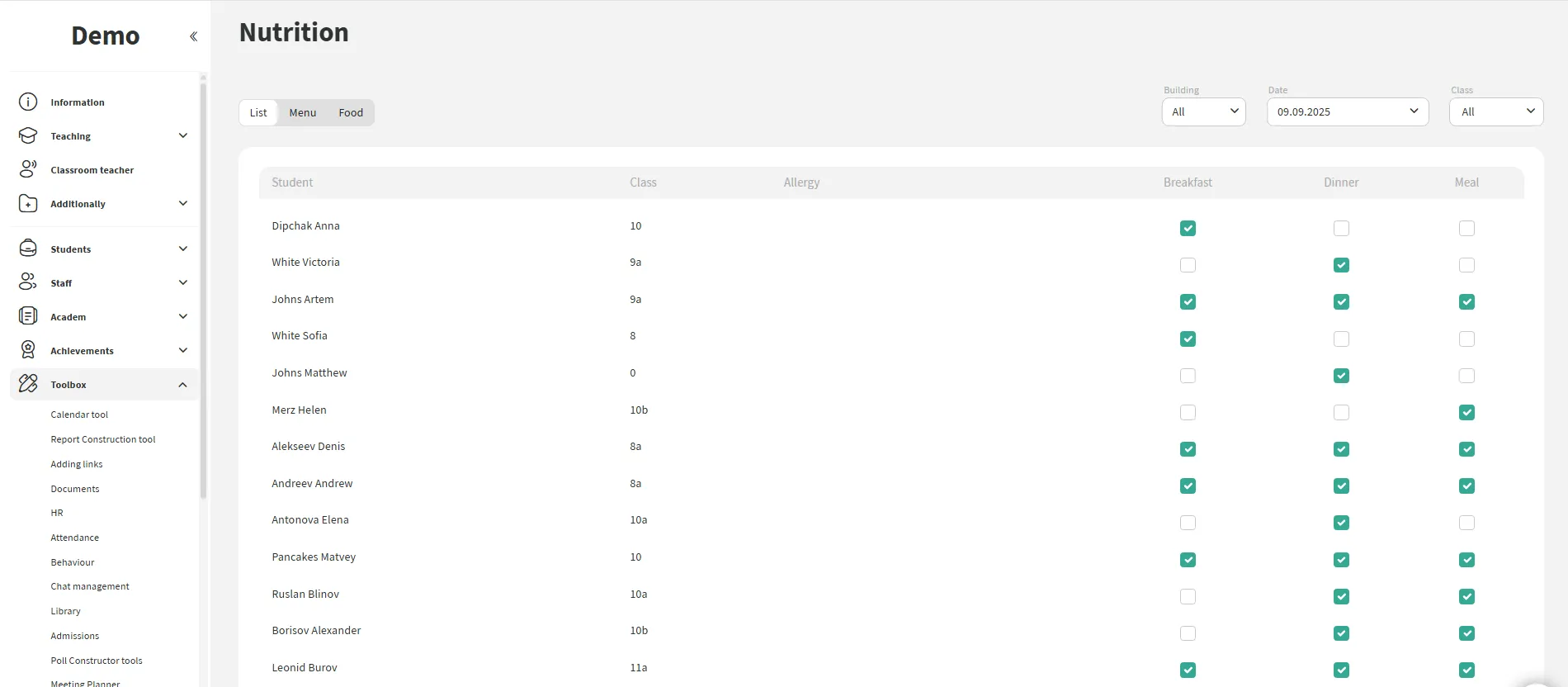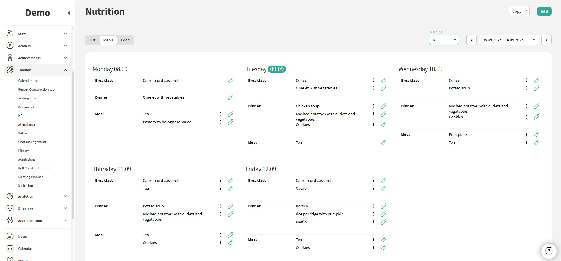 A escola pode preparar o cardápio das refeições com antecedência, adicionando pratos com fotos e copiando o cardápio para outros dias ou semanas.