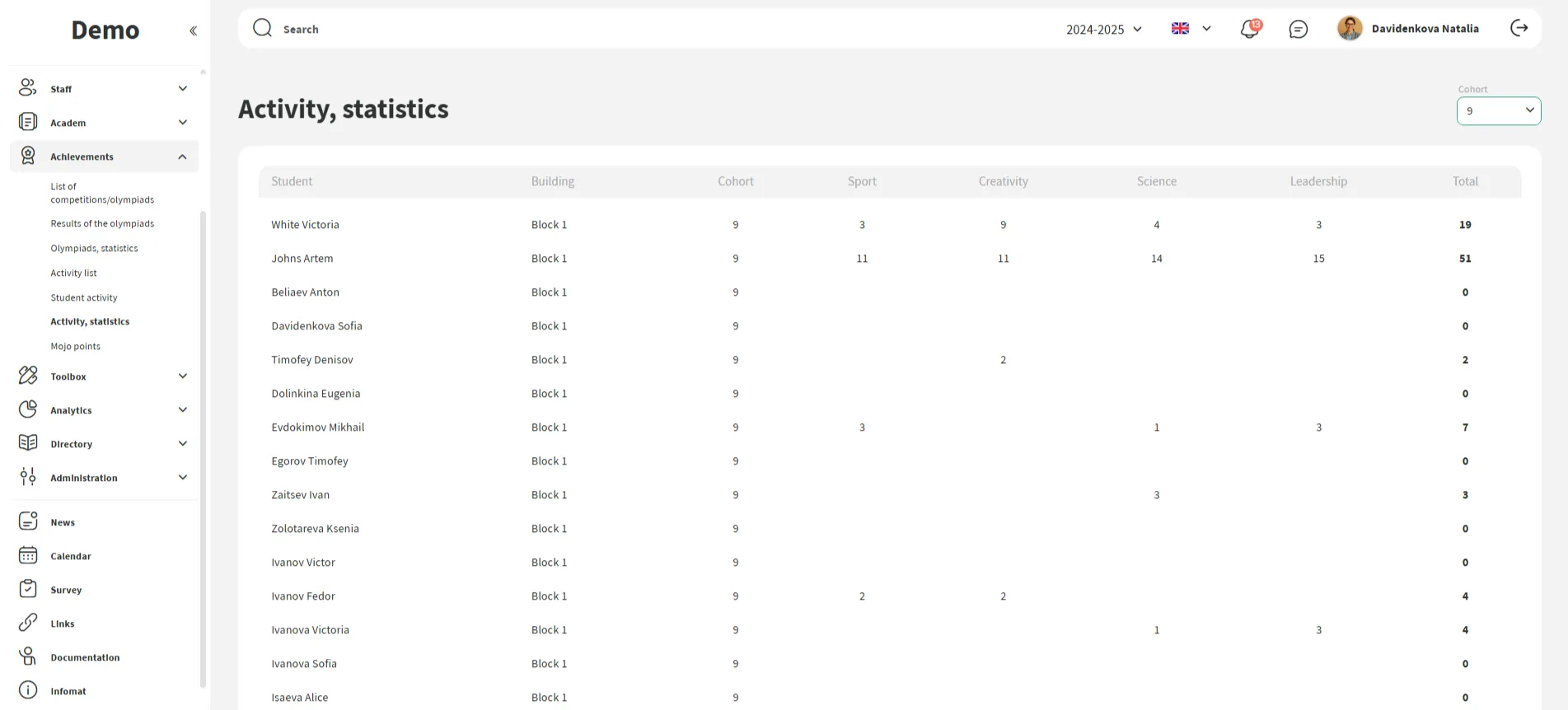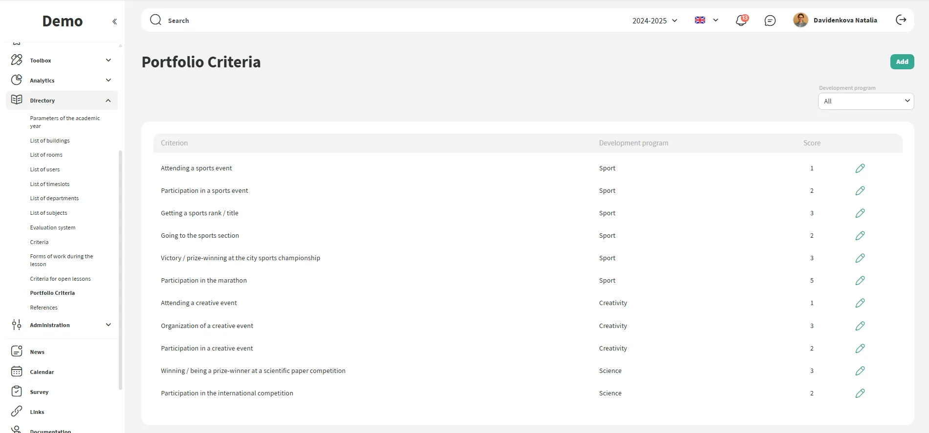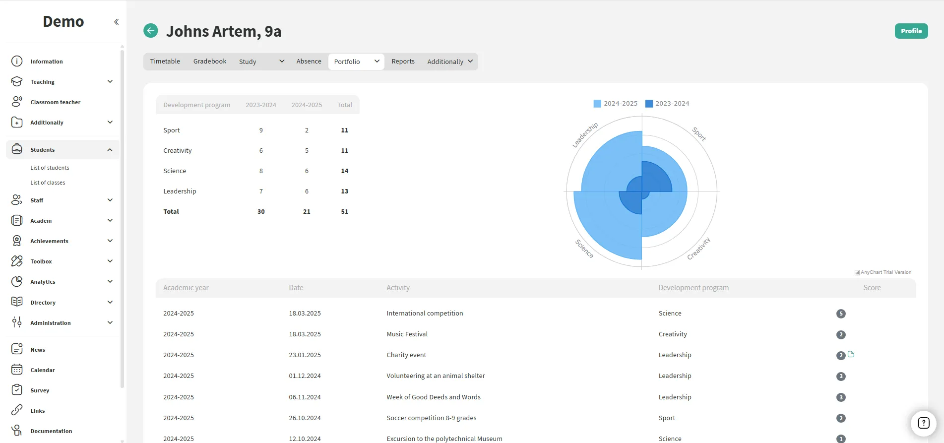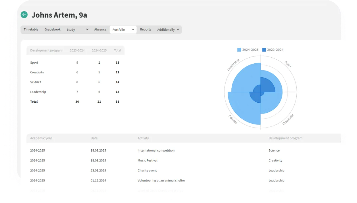 A escola define direções de desenvolvimento (esporte, ciência, liderança, criatividade)