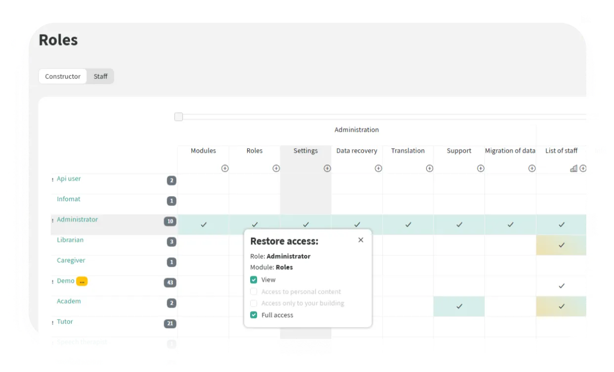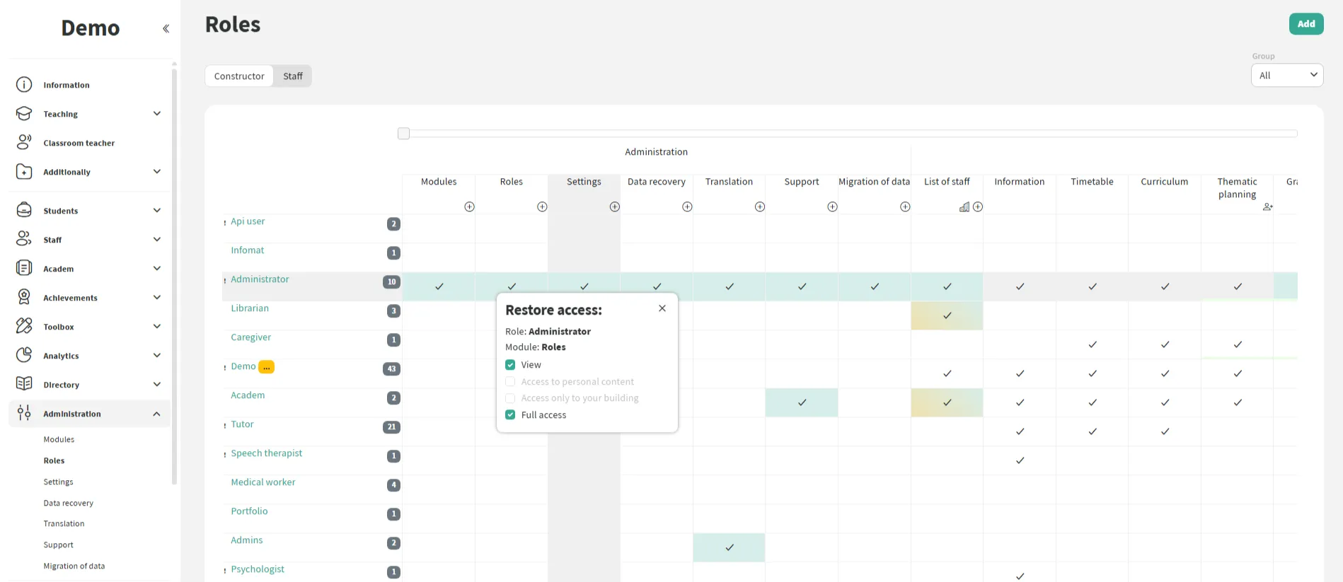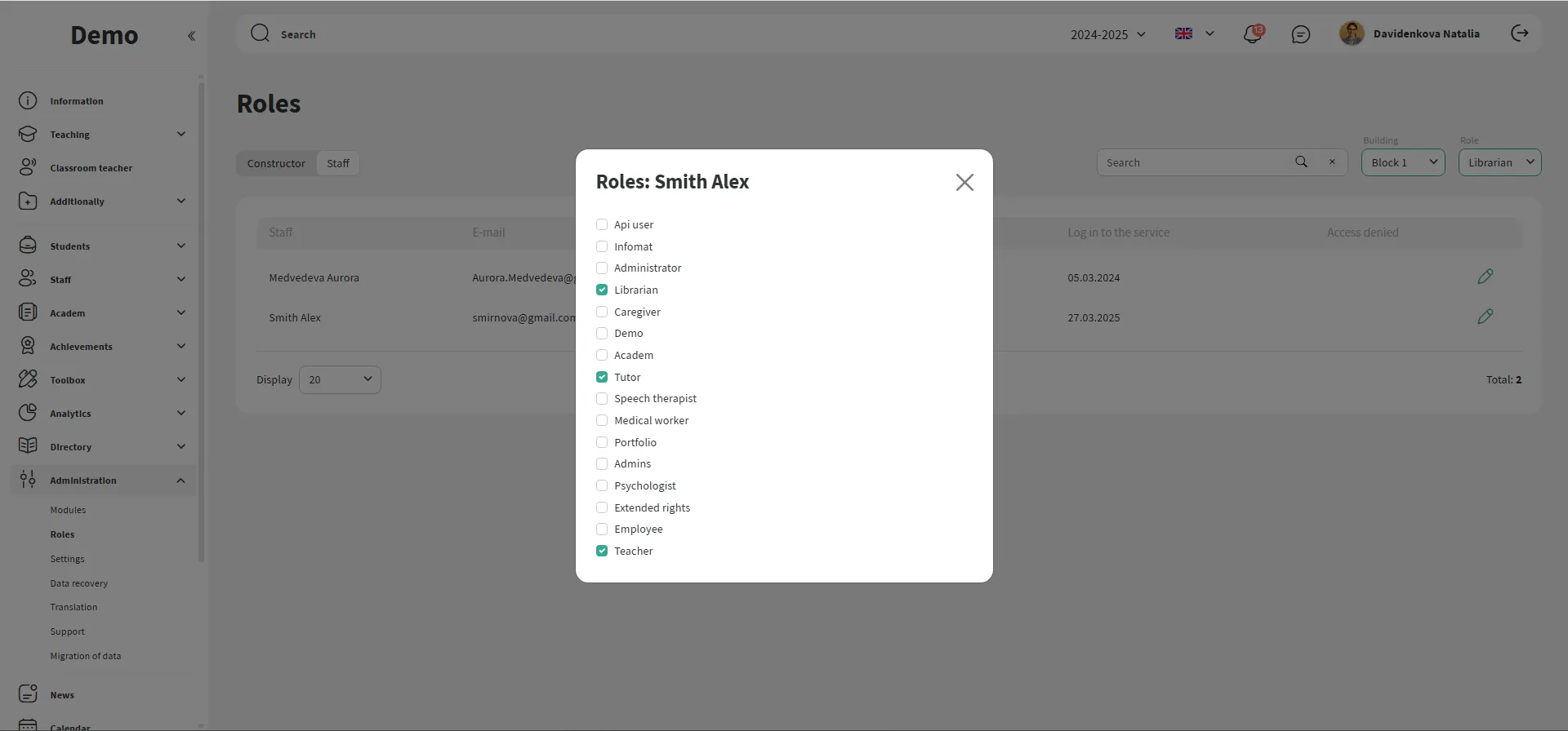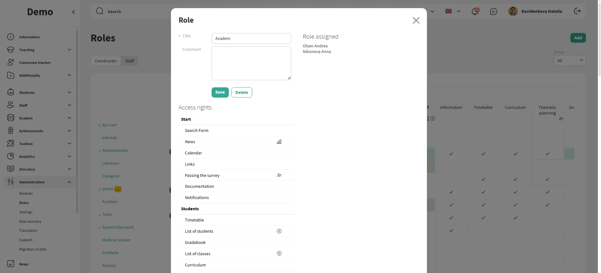 Você pode criar quaisquer papéis: vice-diretor, coordenador de projetos, organizador educacional, metodologista, etc. Cada papel recebe permissões apenas para os módulos de que necessita.