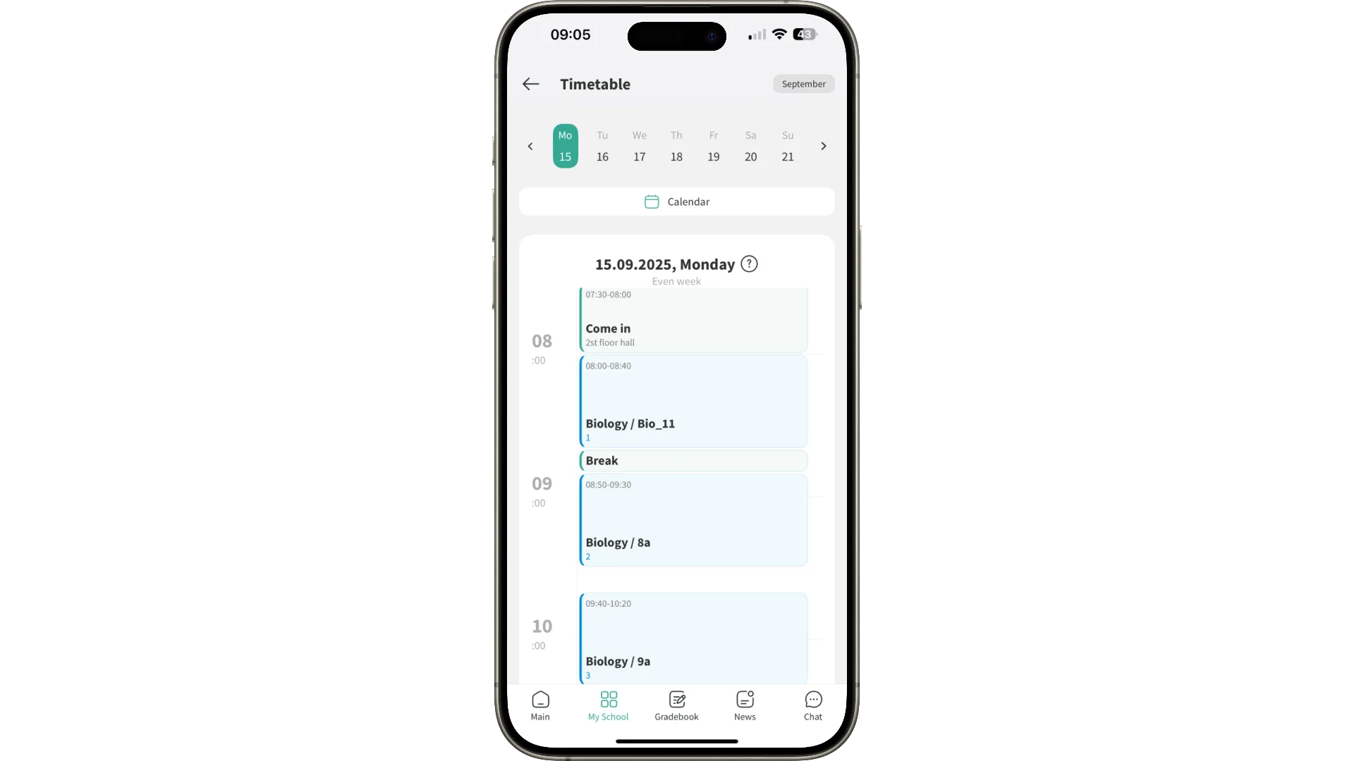 O horário atual e as notificações de substituição estão sempre no seu celular. Aulas por dia, hora e sala — tudo atualizado automaticamente.