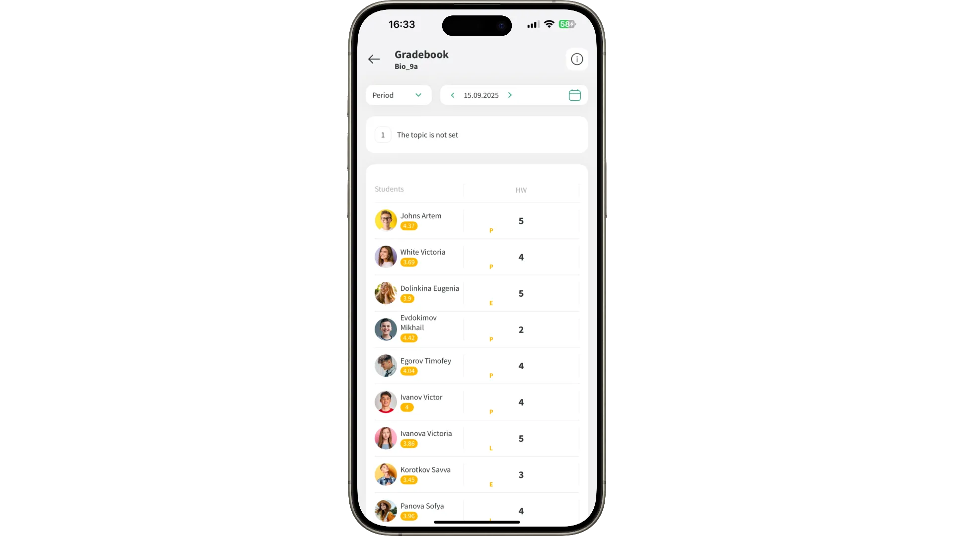 Registre notas, marque presença, escreva comentários e atribua tarefas — tudo na mesma interface usada no computador, mas otimizada para acesso rápido.