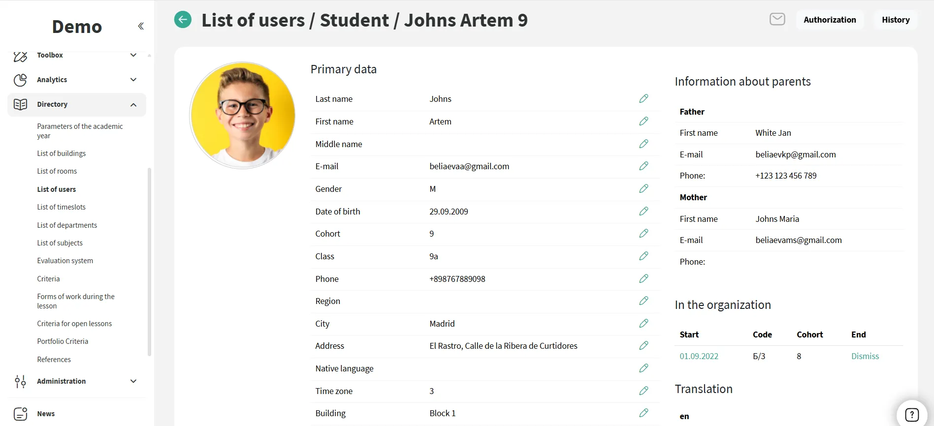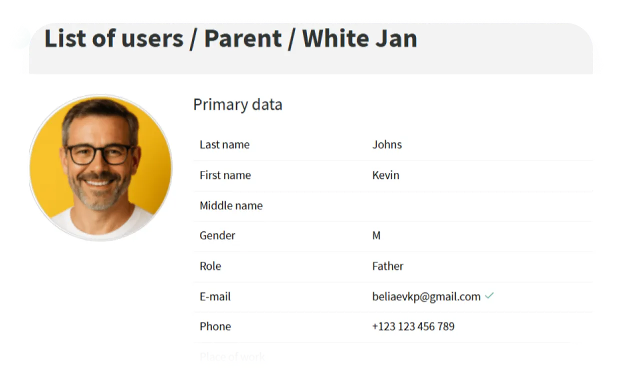 Um perfil individual é criado para cada aluno com informações pessoais e acadêmicas. O sistema permite upload em massa e atribuição por edifícios, turmas e grupos. Todos os dados podem ser editados pela interface do administrador.