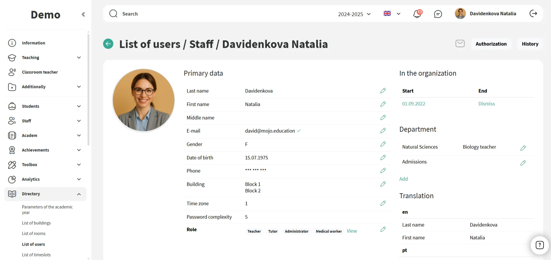 Os membros da equipe podem ser adicionados manualmente ou por listas. Os perfis registram contatos, cargo, função e departamento. Mesmo após a demissão, o perfil pode ser restaurado — o histórico de trabalho e as conexões são preservados.